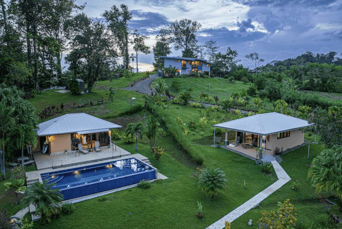 Your dream of tropical romance and adventure is waiting at the Captivating Ocean View Retreat in Costa Rica. Positioned on a generous 2.62-acre parcel, this property not only showcases panoramic ocean views but also offers a seamless blend of comfort and luxury across its spacious four-bedroom main house and two charming guest houses.